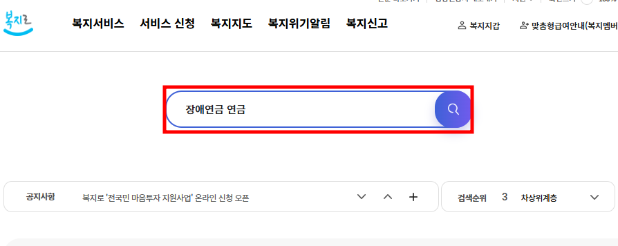 ② 로그인 후 > 메인화면 검색란에 '장애인 기초연금' 검색