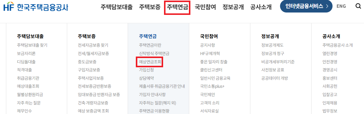- 주택연금 > 예상연금 조회를 선택합니다.