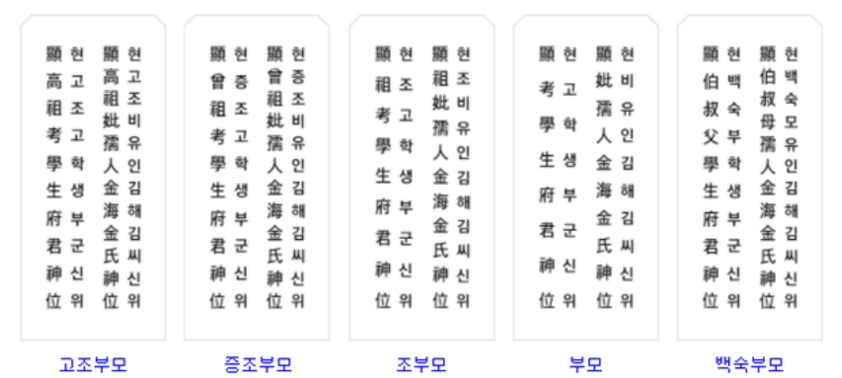 - 마지막 줄에는 항상 神位(신위)를 적어 고인의 영혼을 기립니다.