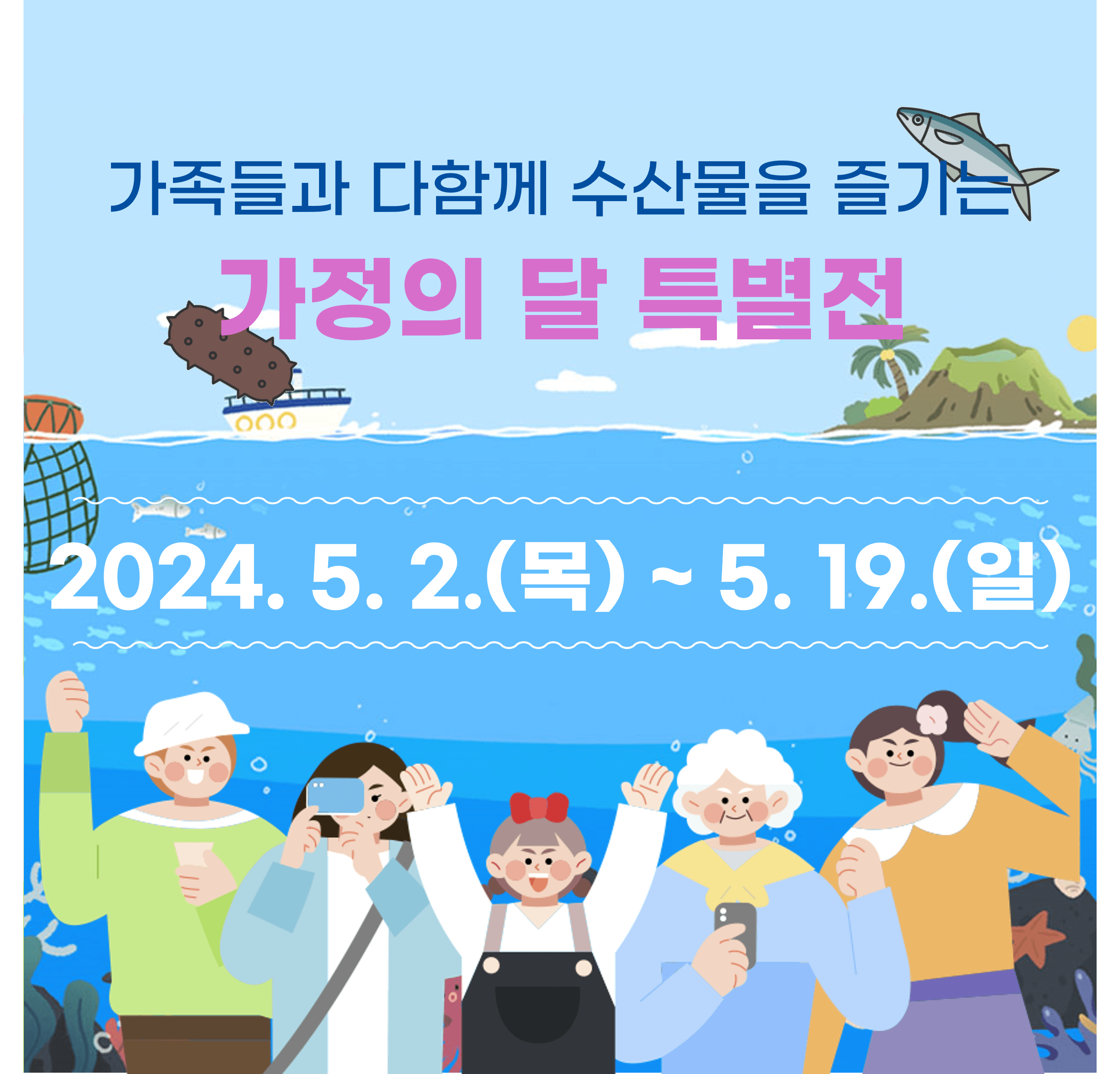 대한민국 수산대전에서 5월 가정의 달 특별전을 개최합니다. 5월 2일(목)부터 19일(일)까지 진행되며, 마트(18개사)와 온라인몰(27개사)에서 국내 수신식품을 구매할 때 구매 금액의 최대 50% 할인되는 쿠폰을 제공합니다.