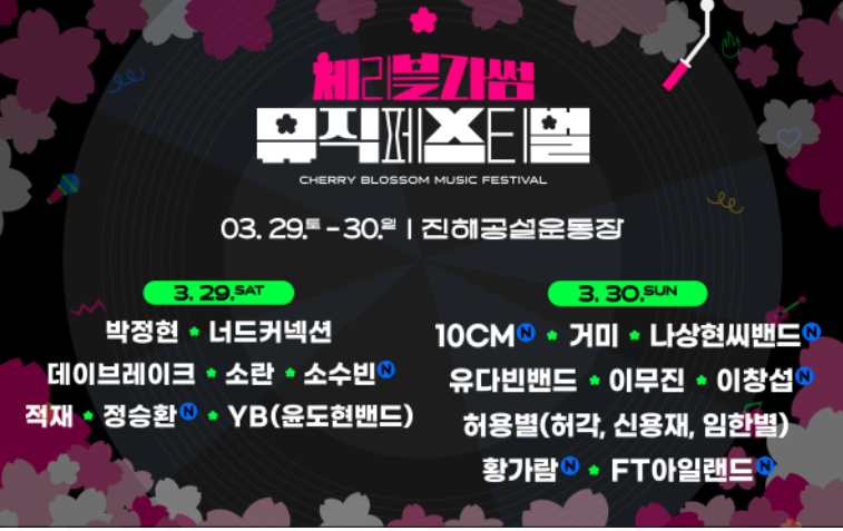 진해 군항제와 함께하는 체리블라썸 뮤직페스티벌에서 최정상급 아티스트들의 공연을 라이브로 즐겨보세요!