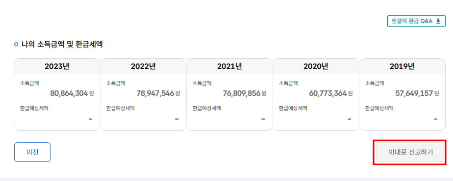 3. 지난 신고 내역 확인 (2019~2023년) > 환급 대상자일 경우 ‘이대로 신고하기’ 버튼 클릭