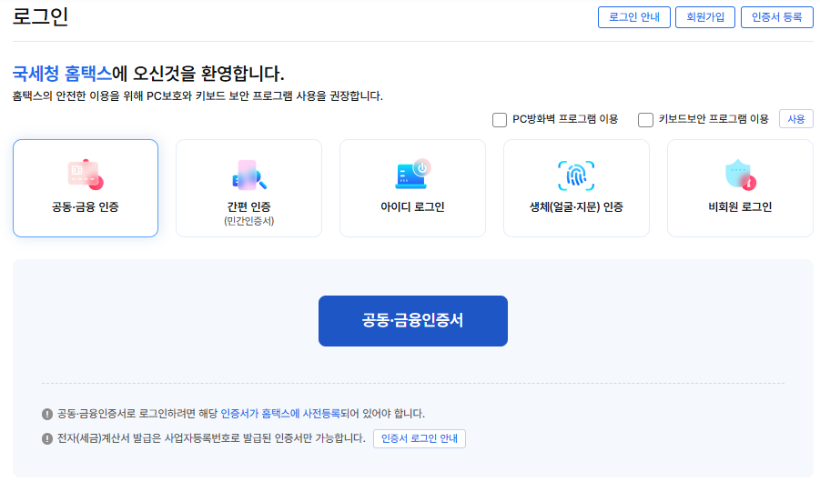 1. 홈택스 or 손택스 접속 > 공동인증서 로그인