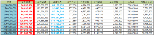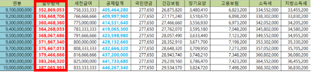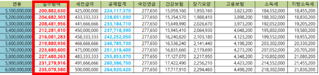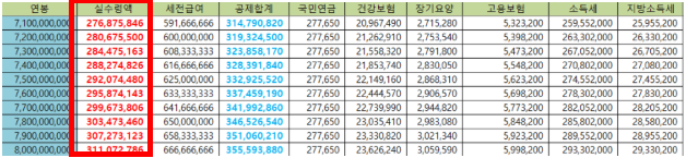 ▶ 이 구간에서는 한 달에 2억 원 이상 실수령액이 찍힙니다.