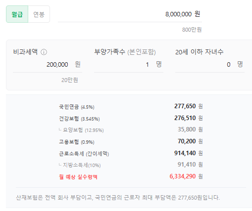 이 항목들을 모두 적용한 금액이 아래 실수령액 표에 반영되어 있어요.