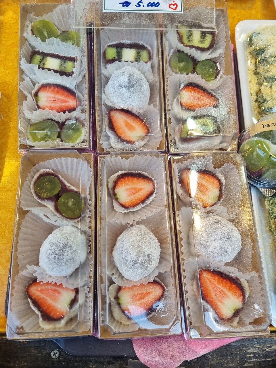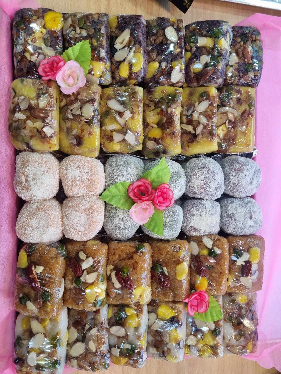 위에 부드럽게 올라간 카스테라 고물이 떡의 식감을 한층 더 부드럽게 감싸주는 봄 한정판 떡입니다.