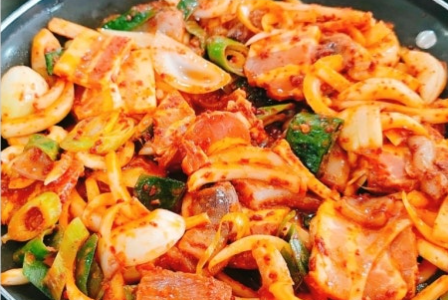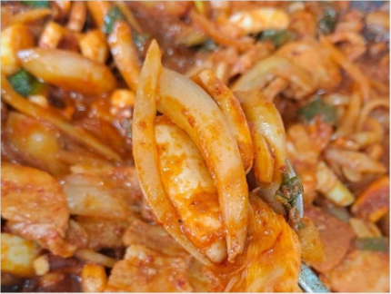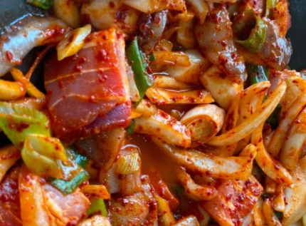 삼겹살의 기름진 맛과 오징어의 쫄깃한 식감이 고추장의 감칠맛과 만나, 밥도둑 그 자체!