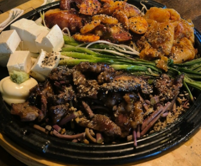 대표 메뉴 ‘파 새참’은 철판 위에 소갈비살, 문어, 관자, 두부김치와 함께 쪽파·파채·감태 주먹밥이 어우러진 구성입니다.