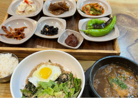 매일 아침 수확한 신선한 나물로 만들어지는 12가지 이상의 반찬과 청국장이 기본으로 제공됩니다. 모든 음식이 인공조미료 없이 자연의 맛으로만 완성됩니다. 특히, 넉넉하게 제공되는 나물은 리필이 필요 없을 만큼 푸짐합니다.