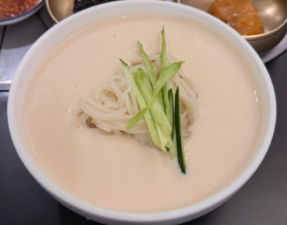이 식당의 콩국물은 매일 아침 신선한 콩을 삶아내고 맷돌에 직접 갈아 만들기 때문에 깊고 진한 고소함이 살아 있습니다.