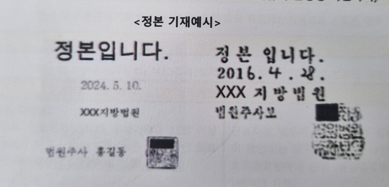 | 필수확인사항 | ①신용회복위원회의 신용회복지원 제도에 따른 개인워크아웃, 프리워크아웃(사전채무조정) 결정은 신청불가 ② 법원주사가 날인한 '정본여부 확인' (결정내용 및 서류의 신빙성 확인목적) <정본 기재예시> ![]() |