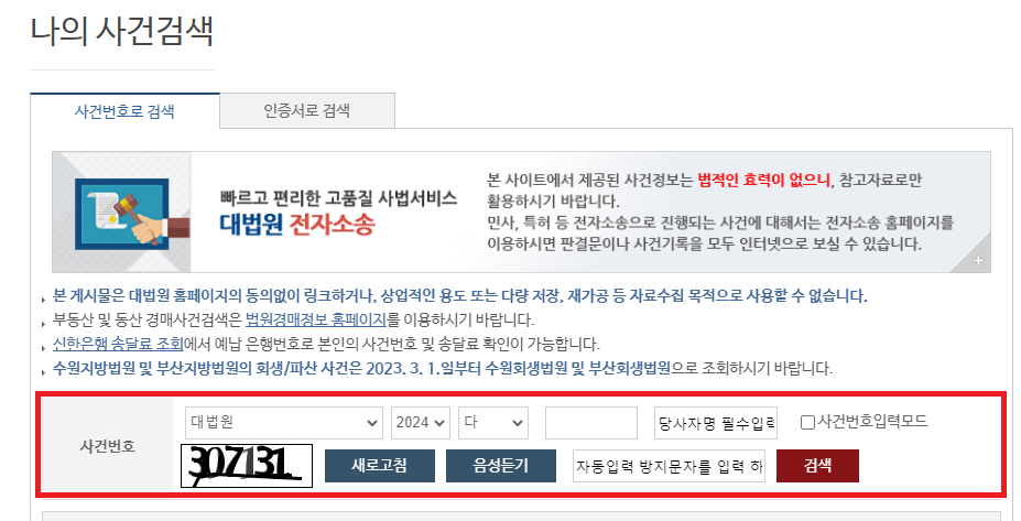 ③ 사건번호 및 당사자명 입력 > 검색