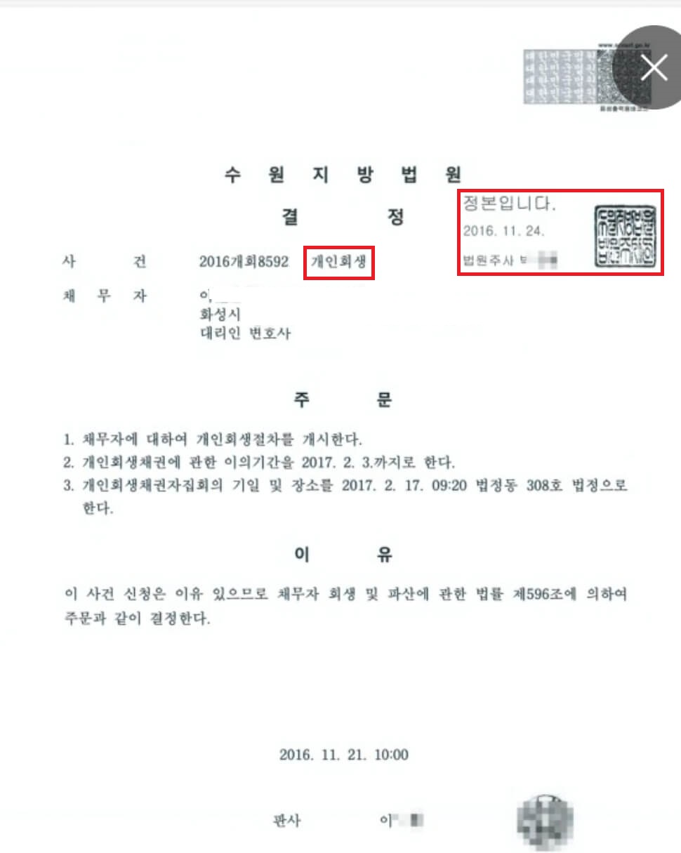 *개인회생 개시결정문(또는 확정증명원) *개인회생 절차 변제 인가 결정문(또는 확정증명원) [견본] ![]() |