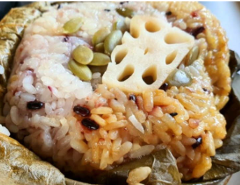 연잎에 싸여 찜기에 푹 쪄낸 밥은 쫀득한 찹쌀과 대추, 은행, 밤, 잣 등의 고소한 재료가 어우러져 깊은 맛을 자아냅니다.