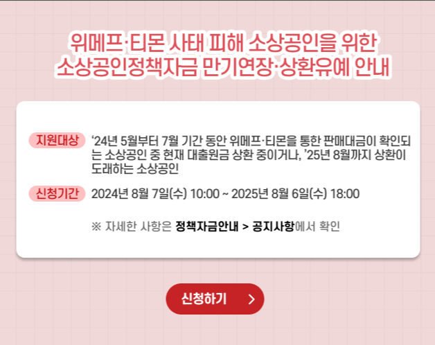 - 신청대상 : 위메프 또는 티몬으로부터 판매대금 미정산 피해를 입은 것으로 인정되는 소상공인