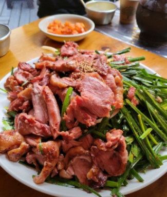 특히 고기 아래 듬뿍 깔린 부추무침은 칠면조의 육즙을 머금어 별미로 손꼽히며, 양파와 함께 먹으면 감칠맛이 더욱 살아납니다.