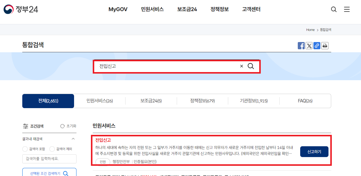 ③ 전입신고 메뉴 선택: 메인 화면에서 전입신고를 검색한 후 해당 메뉴로 이동합니다.