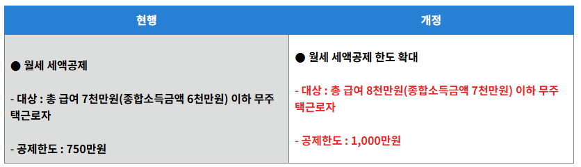 2025 연말정산 월세 세액공제 한도 확대 내용을 아래와 같습니다. 반갑게도 공제한도 확대되어 더 많은 사람이 세액공제 혜택을 받을 수 있게 되었습니다.
